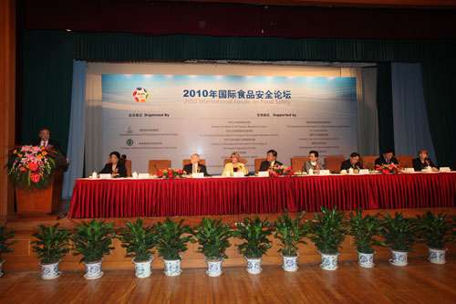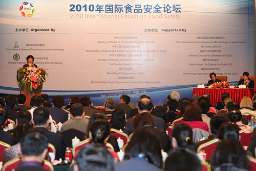由國際食品科技聯(lián)盟和中國食品科學技術(shù)學會聯(lián)合主辦的“2010年國際食品安全論壇”于2010年4月22-23日在北京隆重召開,此次論壇以“風險管 理:概念與實踐”為主題,來自全球的近300位政府官員、科技專家、知名企業(yè)的代表參加了會議。論壇得到衛(wèi)生部、科技部、工業(yè)和信息化部、世界衛(wèi)生組織、 聯(lián)合國糧農(nóng)組織、國際食品微生物標準委員會、國際生命科學會等國內(nèi)外重要政府部門和機構(gòu)的支持。衛(wèi)生部部長陳竺出席開幕式,并做重要講話。